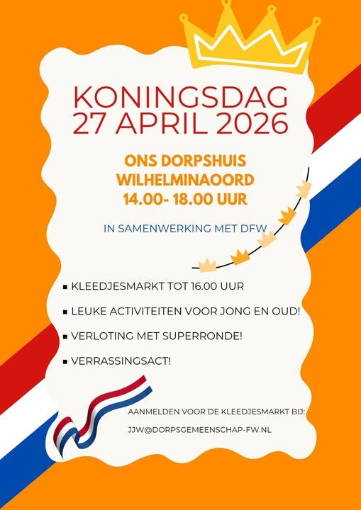 We hebben weer allemaal leuke activiteiten bij Ons dorpshuis in Wilhelminaoord met koningsdag!