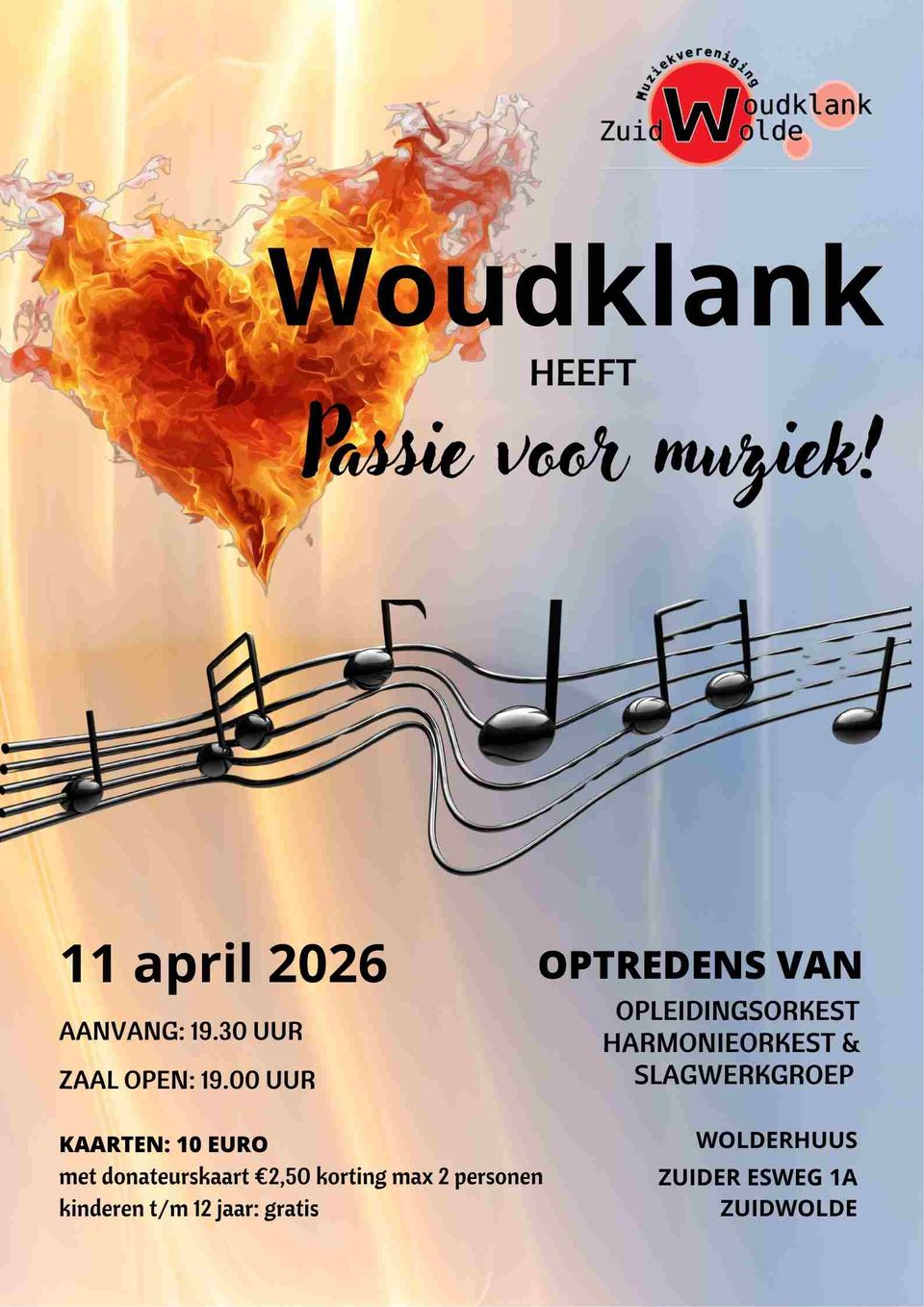 Locatie: ZuidwoldeTijdens het jaarlijks donateursconcert in het Wolderhuus, spelen het Opleidingsorkest, de Slagwerkgroep en het Harmonieorkest een gevarieerd muzikaal programma.