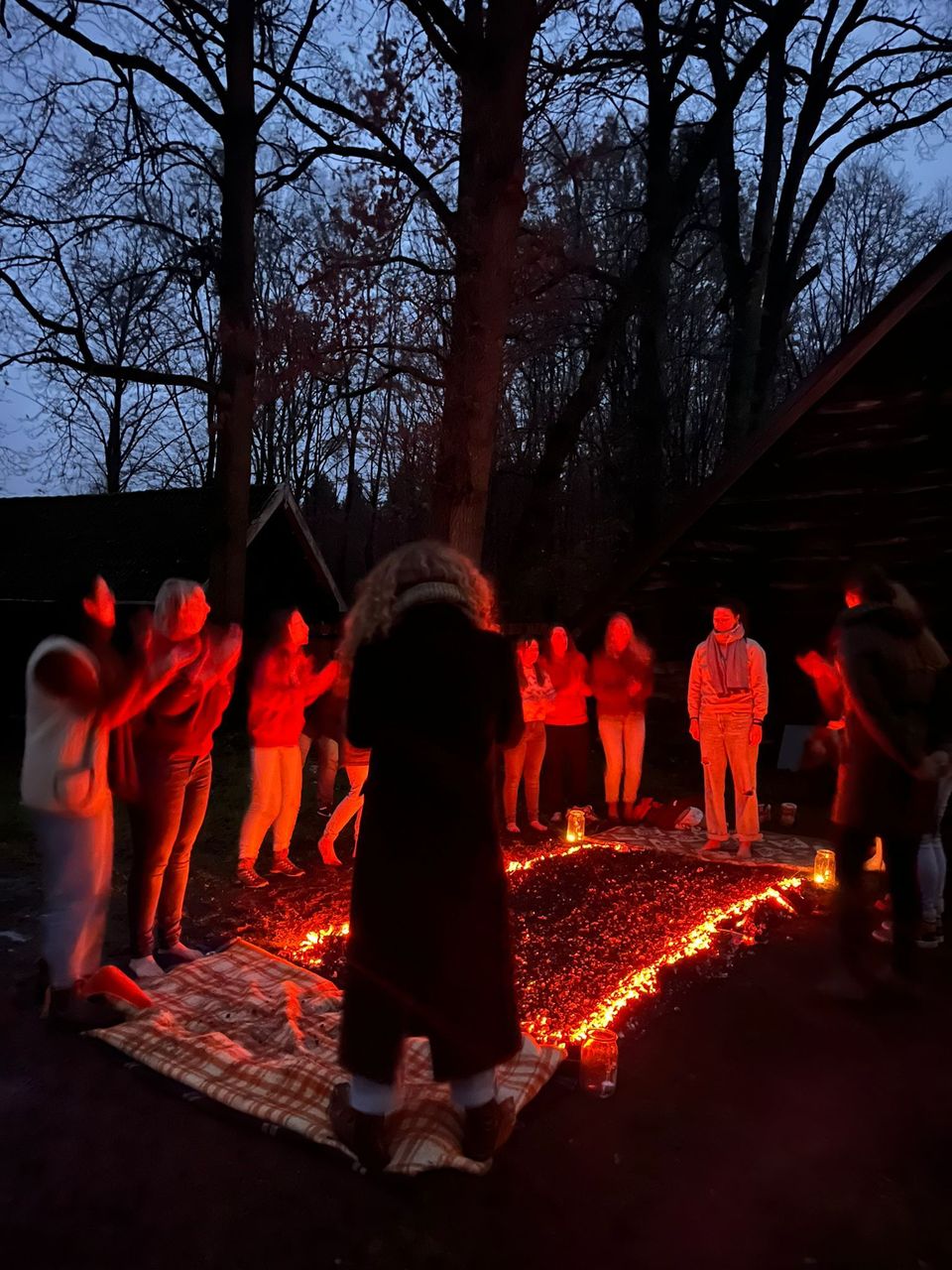Ondertussen zijn de houtblokken getransformeerd tot kolen. Onder begeleiding van Drum lopen we terug naar de Vuurplek om het vuurpad te aanschouwen. Staand voor het vuurpad ga je pas besluiten of je een ja of een nee hebt om over de kolen te lopen, om jouw hartsverlangen te bekrachtigen. Jouw nee is net zo krachtig als je ja. Bij een nee, loop je langs de kolen naar de overkant.