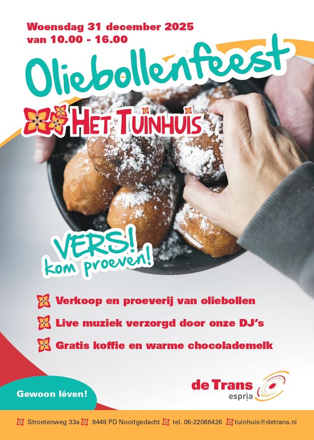 Het Tuinhuis is een dagbestedingsplek waar met veel zorg plantjes en sfeerproducten worden gemaakt. Eén keer per jaar wordt daar iets extra’s aan toegevoegd: verse oliebollen. Iedereen is welkom om te proeven en te kopen, terwijl er gratis koffie, thee en warme chocolademelk wordt geschonken. Muziek zorgt voor de feestelijke sfeer en maakt het tot een gezellige afsluiting van het jaar.