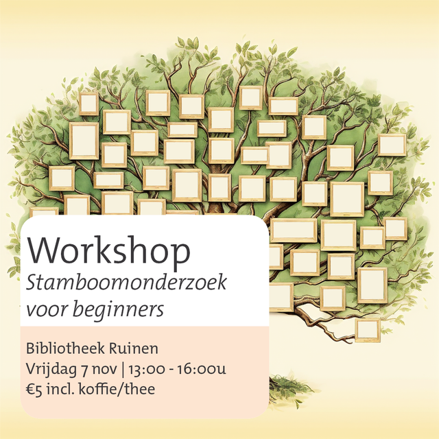 Locatie: RuinenVrijdag 7 november organiseert Bibliotheek Ruinen van 13.00 - 16.00 uur een Workshop Stamboomonderzoek voor beginners bij dorpshuis 't Neie Punt in Ruinen. In deze workshop maak je kennis met genealogie: de zoektocht naar je voorouders en hun verhalen. Wie waren ze? Waar woonden ze? Welke momenten van geluk en verdriet maakten ze mee?