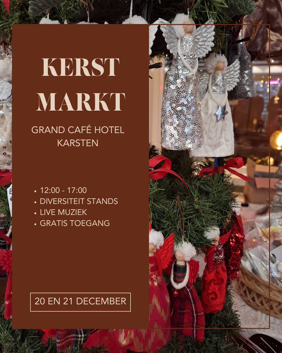 Op zaterdag 20 en zondag 21 december 2025 is het weer tijd voor de sfeervolle Kerstmarkt van Grand Café Hotel Karsten in het hart van Norg!