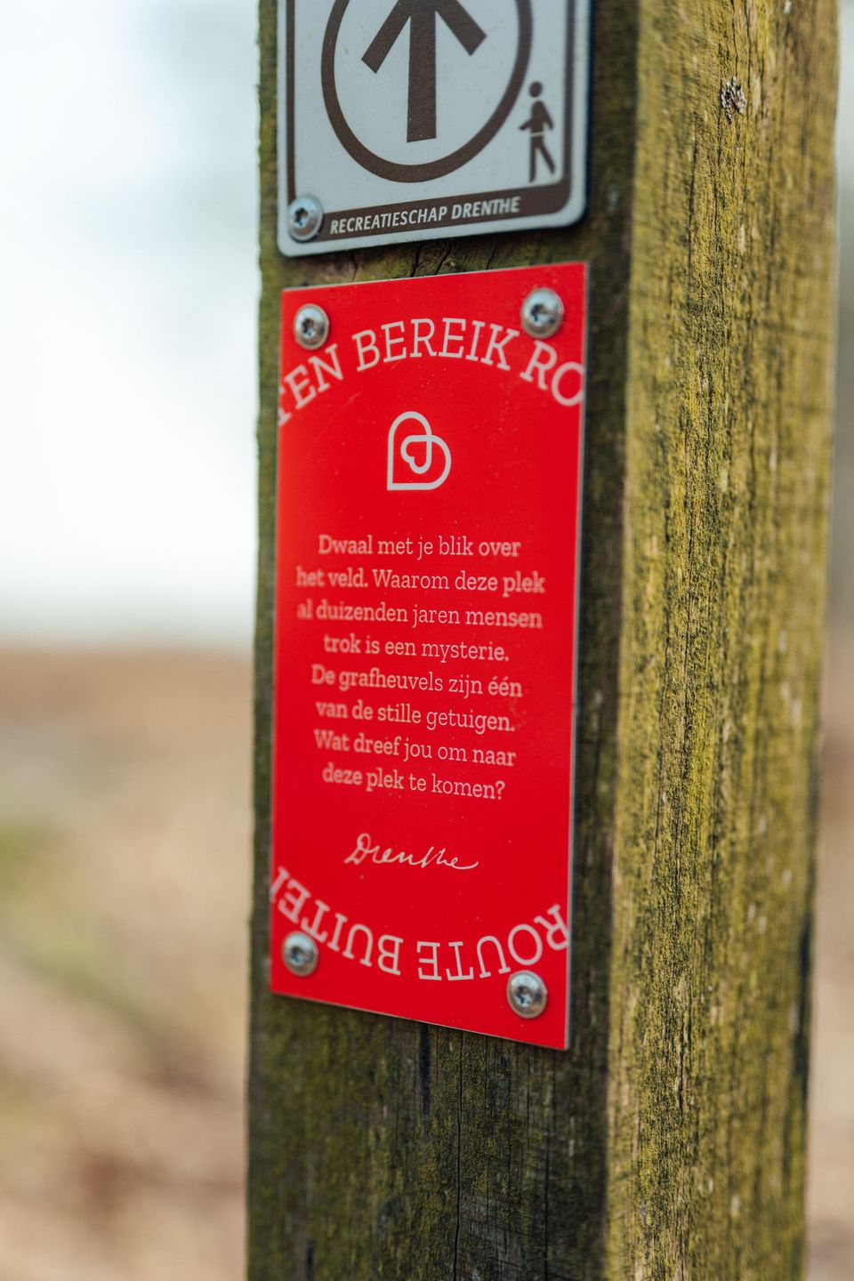 Voor deze wandeling volg je de bestaande wandelroute ‘Noordsche Veld’ door middel van de paarse bordjes. Onderweg kom je extra (rode) Buiten Bereik-routebordjes tegen met korte vragen en opdrachten die je helpen te vertragen.