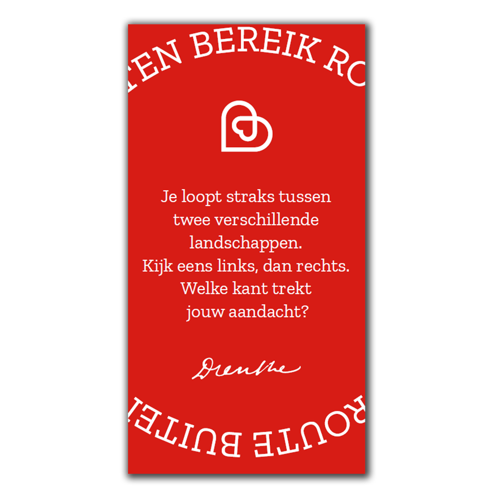 Voor deze wandeling volg je de bestaande wandelroute ‘Kibbelhoek’ door middel van de rode bordjes. Onderweg kom je langs deze route extra (rode) bordjes tegen van Buiten Bereik met korte vragen en reflecties.