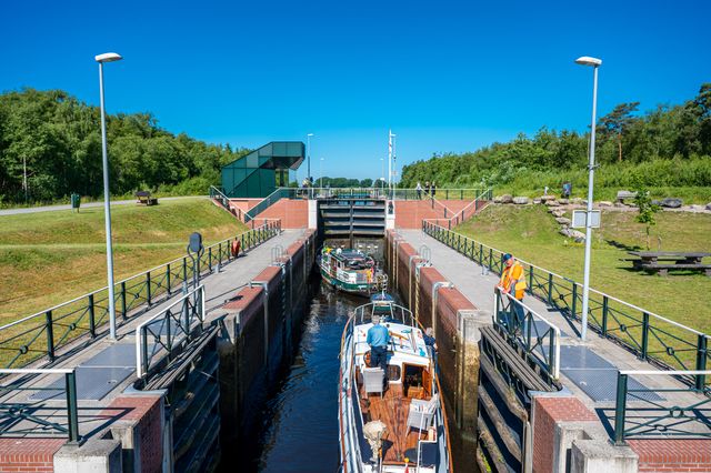 Wat heel bijzonder is, is dat een hoogteverschil van 5 meter in het kanaal wordt opgelost door een zogeheten koppelsluis. Een dubbele sluis van 2 x 2,5 meter. Stap even van uw fiets en neem een kijkje bij deze indrukwekkende sluis.