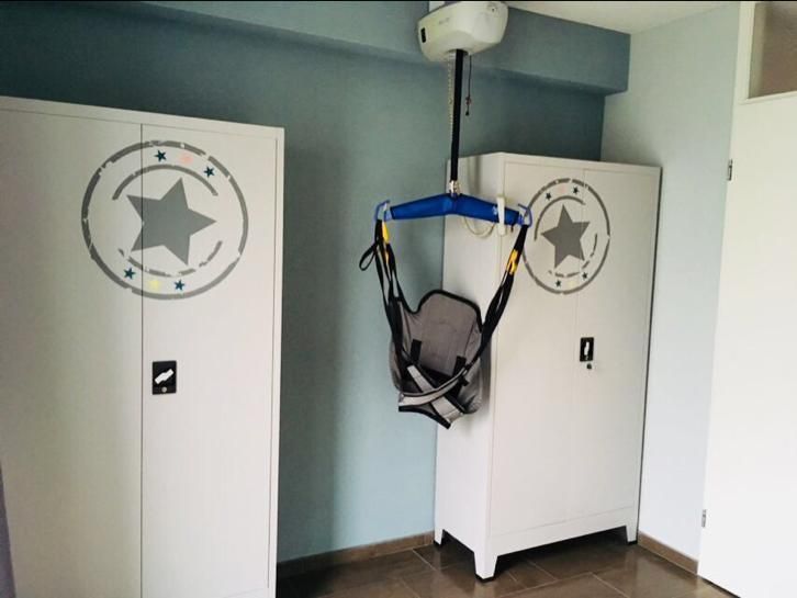 De badkamer is voorzien van een douchebrancard en een plafondtillift.